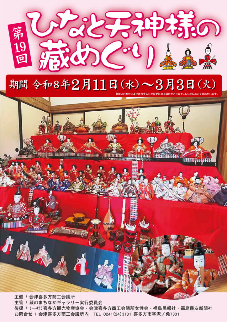 第19回ひなと天神様の蔵めぐり期間中、喜多方市内の店舗にてひな人形と天神様を展示しております。